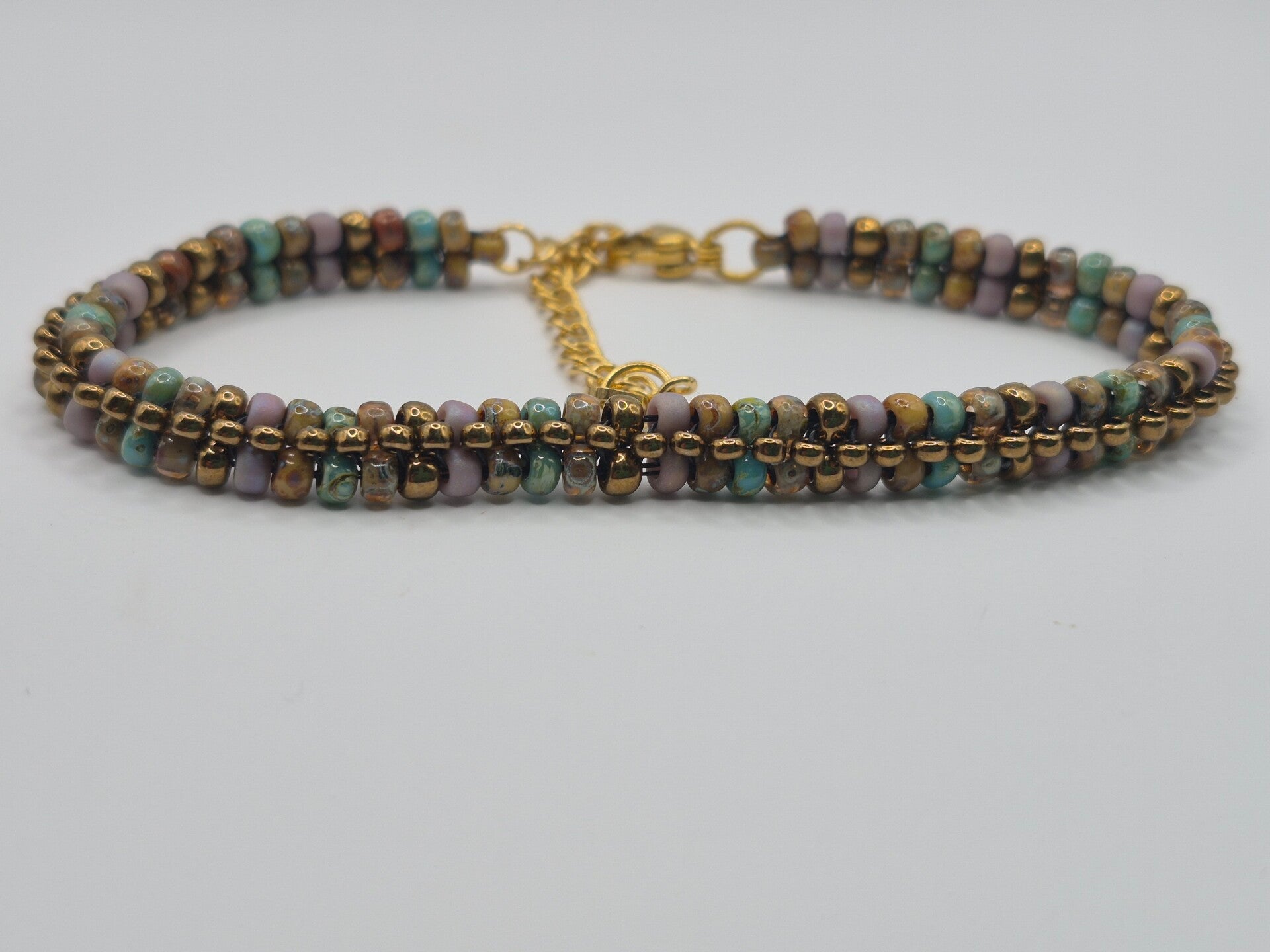 Handgemaakte armband met Miyuki rocailles 8/0 en 11/0 in de Herringbonesteek in verschillende tinten picasso turquoise en bruin, paars en bronze.