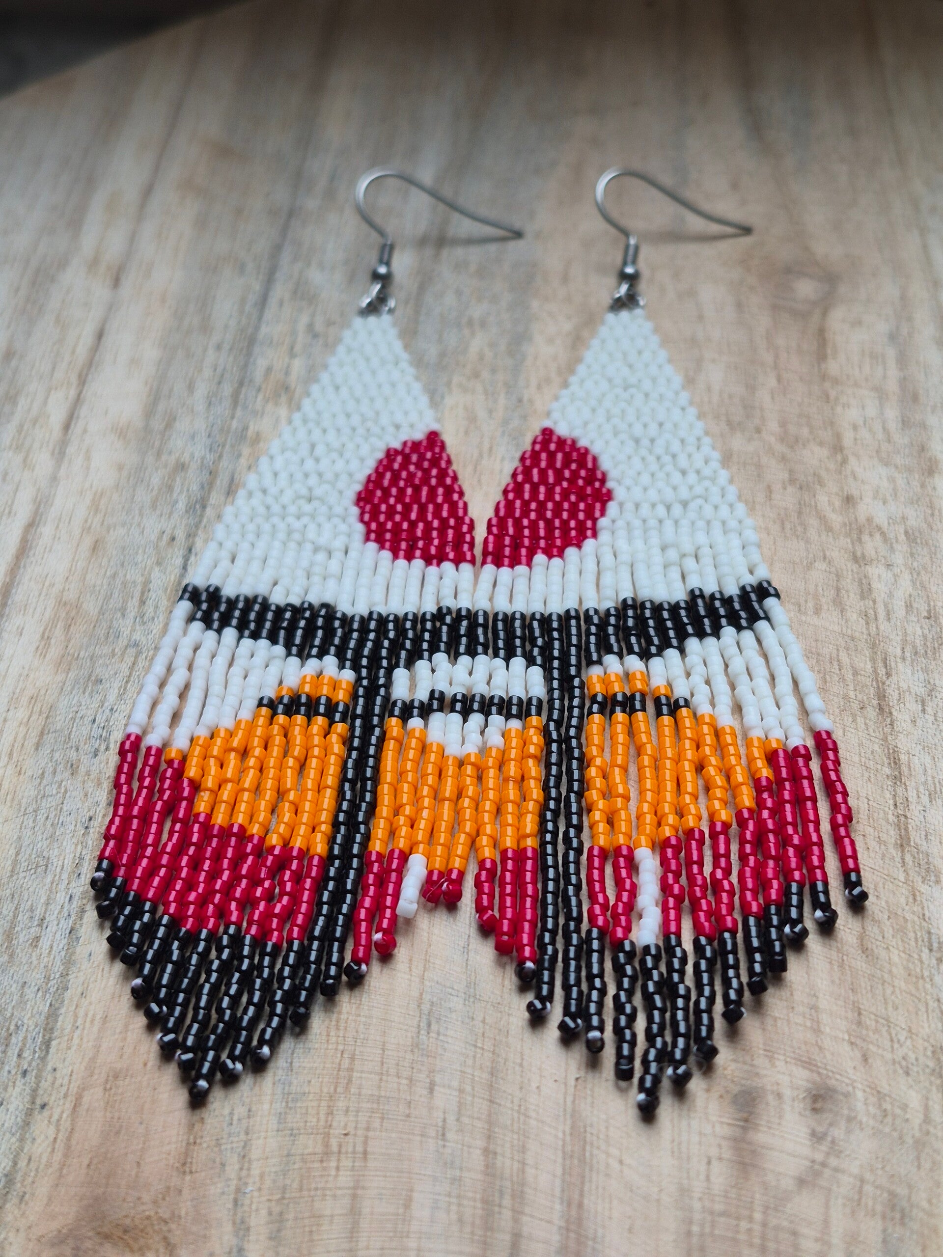 De warme combinatie van mat crème, levendig rood, diep zwart en stralend oranje roept het eerste licht van de zon op dat langzaam de bergen verlicht. Elke oorbel is met de hand geweven met Miyuki Delica 11/0 kralen, geliefd om hun perfecte vorm en verfijnde matte afwerking. De lange franjes versterken het gevoel van beweging en geven het ontwerp een elegante, vloeiende uitstraling.